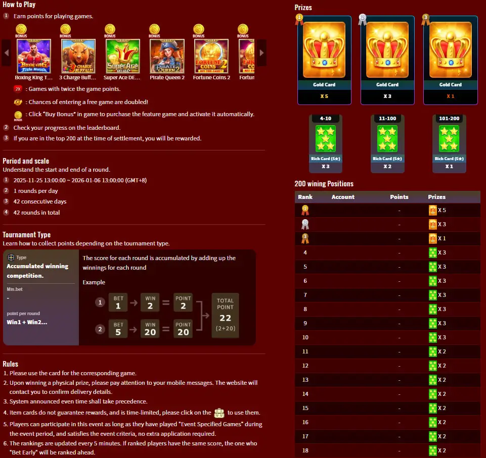 2. Ranking period of the day is 00:00:00~23:59:59 and the highest amounts for a specified period of time is a daily winner.